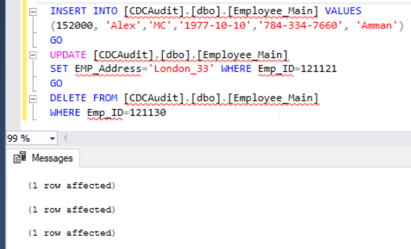 데이터베이스 테이블에서 CDC를 활성화 한 후 해당 테이블에서 아래의 세 가지 데이터베이스 DML 변경 (INSERT, UPDATE, DELETE)을 수행하고 다음과 같이 CDC 기능을 사용하여 이러한 변경 사항을 감사하는 방법을 확인합니다.