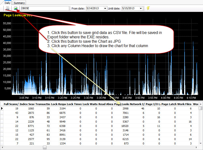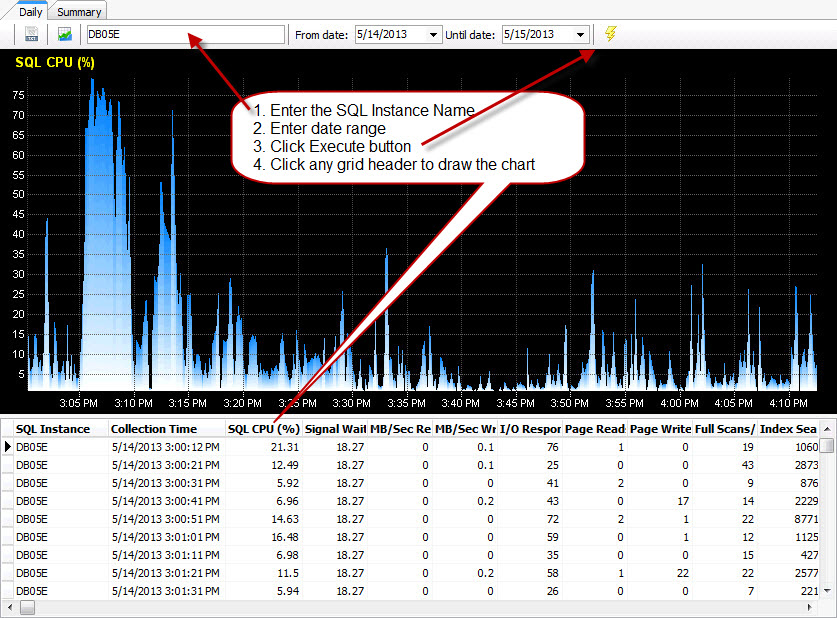 Historical data: In the history tab, put “SQL Instance Name” and “date” to query historical data. Click any column header to view data in the chart. All data and charts can be saved. Figure#4: Historical data browse