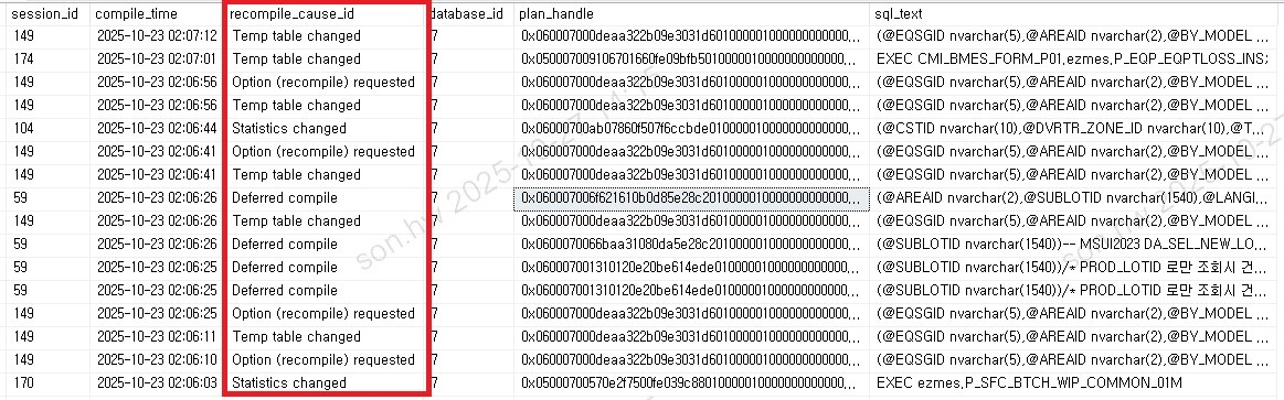 옵션 및 힌트 영향 OPTION(RECOMPILE) 힌트가 있거나, 저장 프로시저에 WITH RECOMPILE이 설정된 경우 매 실행마다 새 계획을 생성합니다. 파라미터 스니핑으로 인해 특정 값에서 기존 계획이 비효율적일 때도 Recompile이 발생합니다.