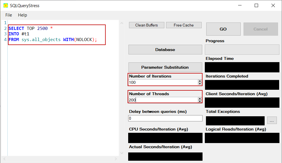 SQLQueryStress를 시작하고 다음 쿼리를 쿼리 패널에 붙여 넣습니다.