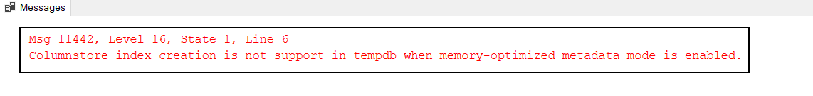 저장 프로 시저 인sp_estimate_data_compression_savings는 작업을 압축하기 전에 테이블에 대해 예상되는 압축 이득을 계산합니다.그러나 메모리 최적화 TempDB 메타 데이터 옵션을 활성화 한 경우이 절차는 columnstore 인덱스를 포함하므로 t1 테이블에 대해 작동하지 않습니다.