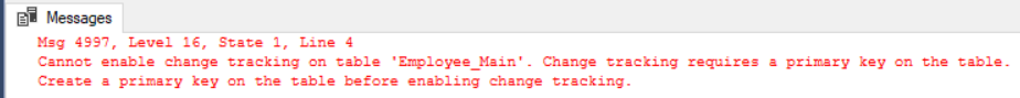 기본 키가 정의되지 않은 데이터베이스 테이블에서 SQL 변경 내용 추적을 활성화하려고하면 ALTER TABLE 문이 실패하여 아래 오류 메시지와 같이 SQL 변경 내용 추적을 활성화하기 전에 테이블에 기본 키를 만들어야 함을 보여줍니다. :